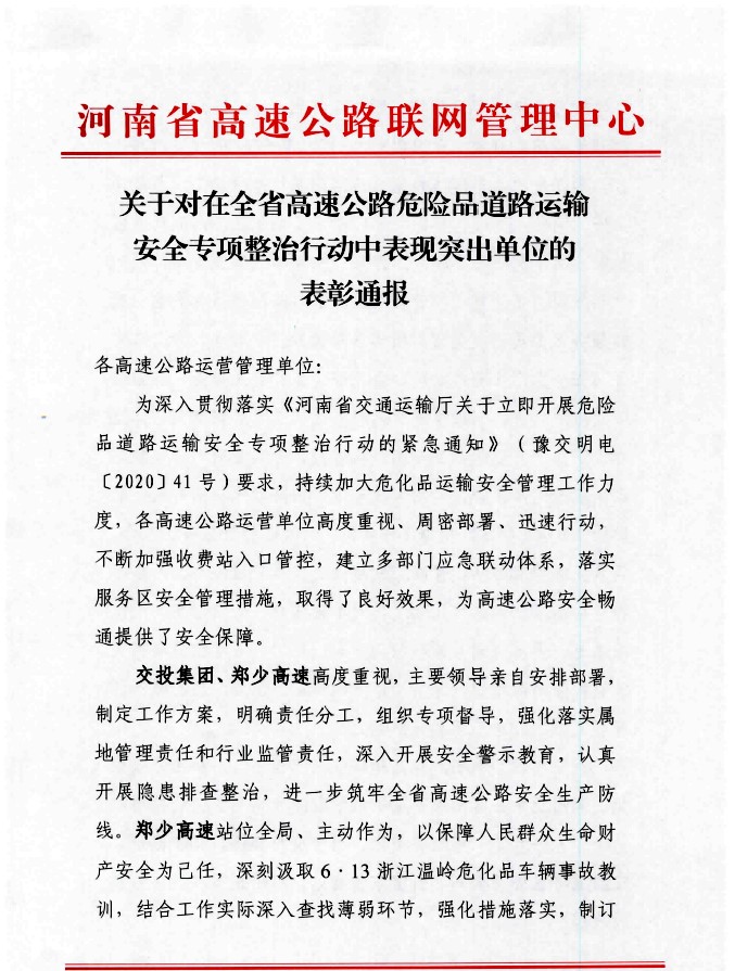 來源: 本站 發布時間: 2020-07-02近期,公司在全省高速公路危險品道路運輸安全專項整治活動中表現突出,省高速公路聯網管理中心對公司高度重視、周密部署,多舉措抓好抓實安全生產工作,給予了充分肯定,并對交投集團、公司及所屬鄭州北服務區全省通報表彰! 6月24日,河南省政府副省長、省公安廳廳長舒慶一行…